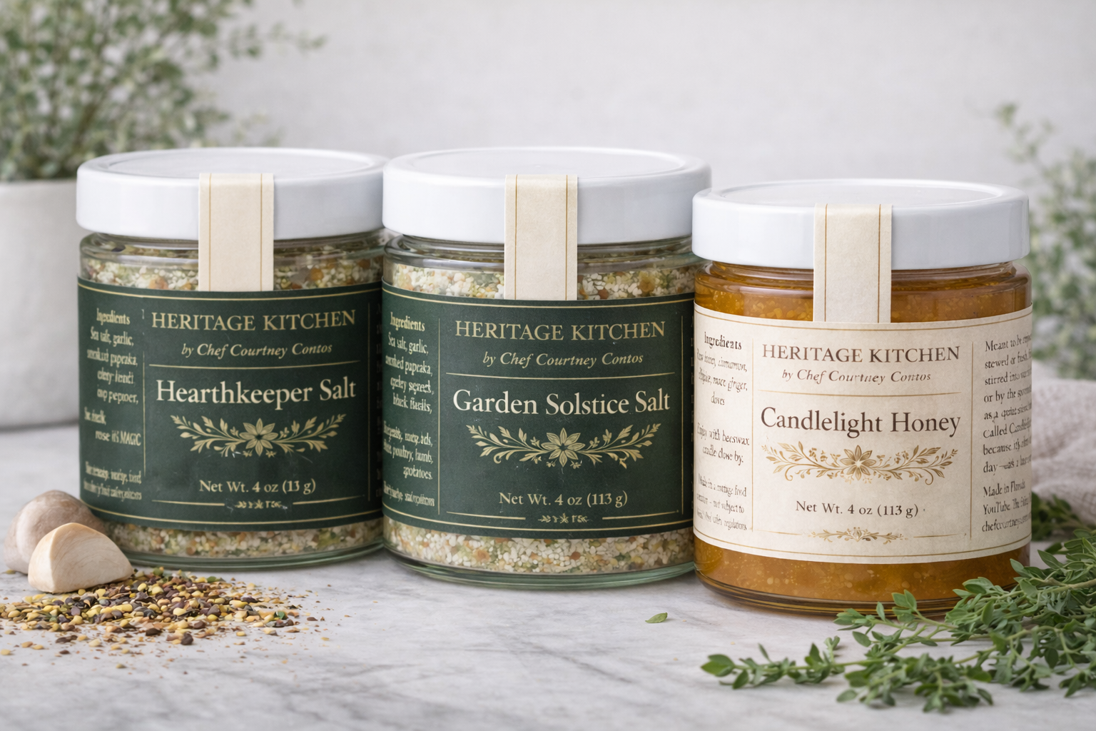 Two everyday salts and one spiced honey, made to live together in the kitchen.